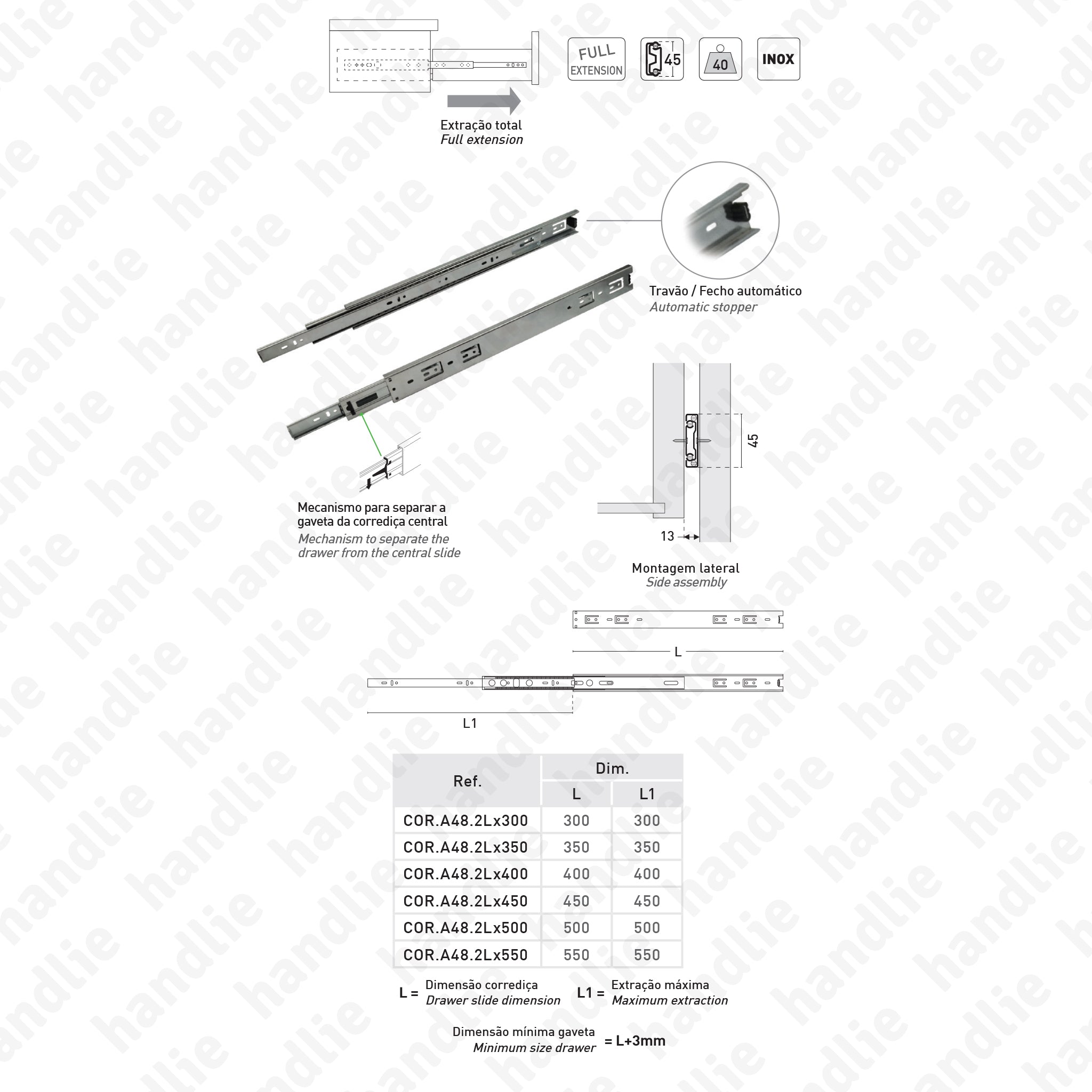 • Com mecanismo de clipar que permite separar a gaveta da corrediça central